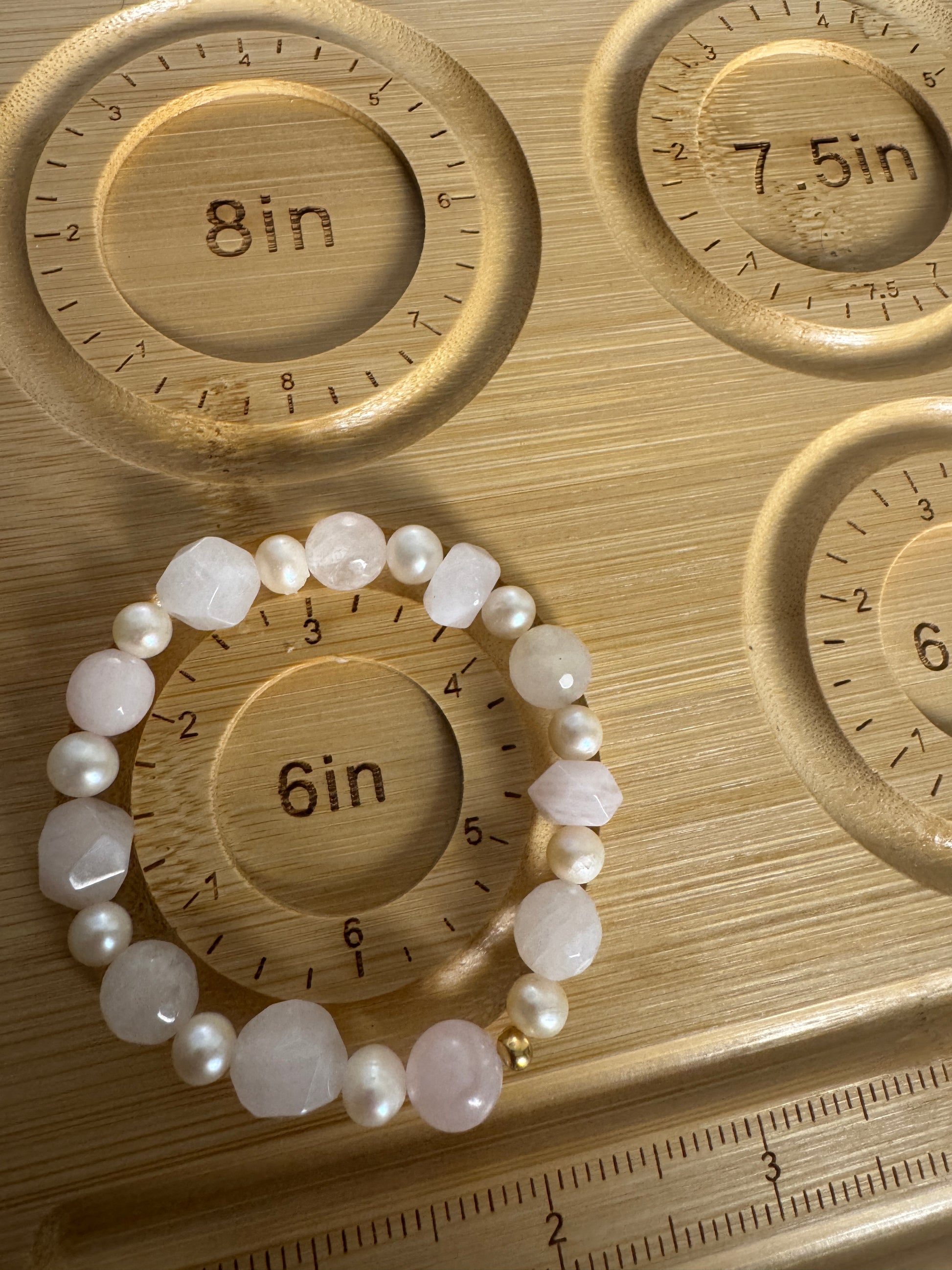 Genuine freshwater pearls alternating with faceted rose quartz gemstone beads on a stretch cord