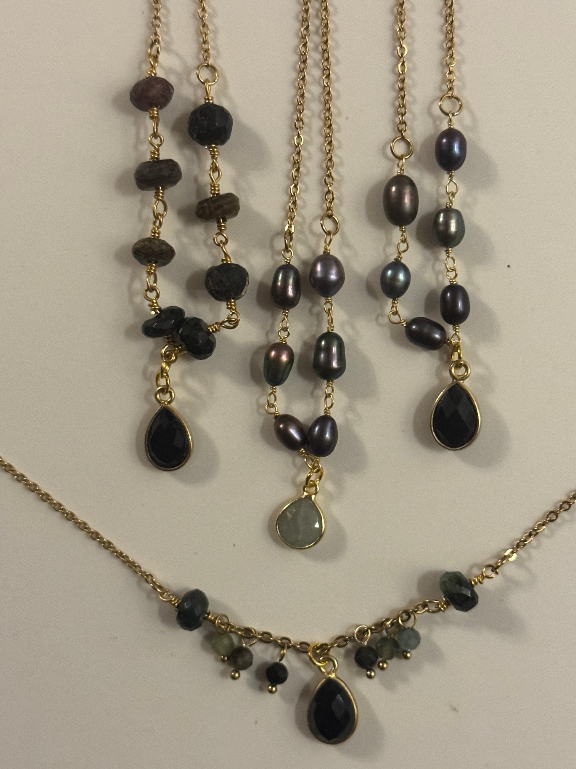 Approx 22 inches gold plated chain with bezel set onyx pendant with tourmaline or peacock pearls