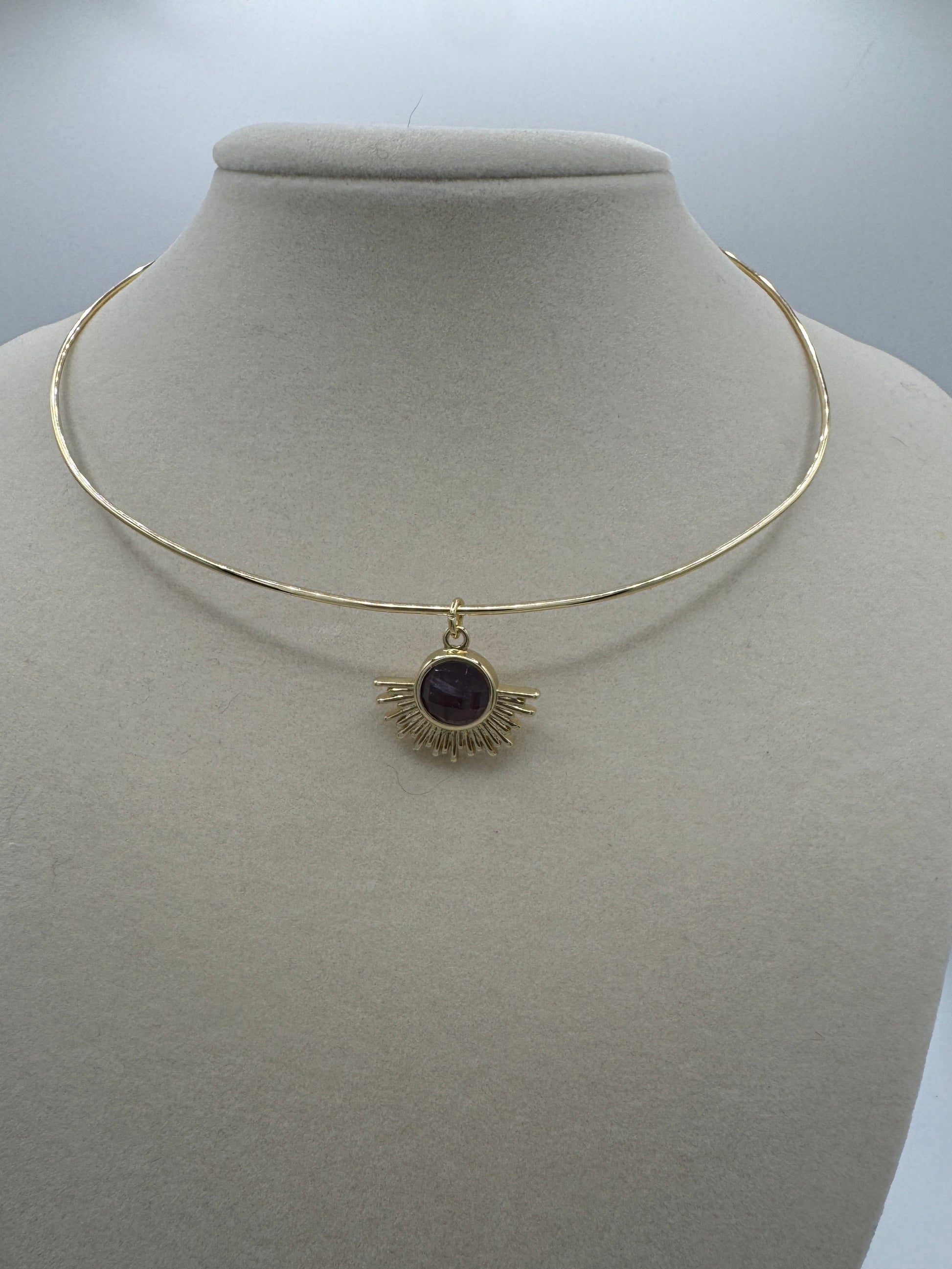 Focus your intuition and belief in yourself with this pink amethyst fan sunburst necklace. This delicate gold plated wire necklace sits gracefully on the collarbones.