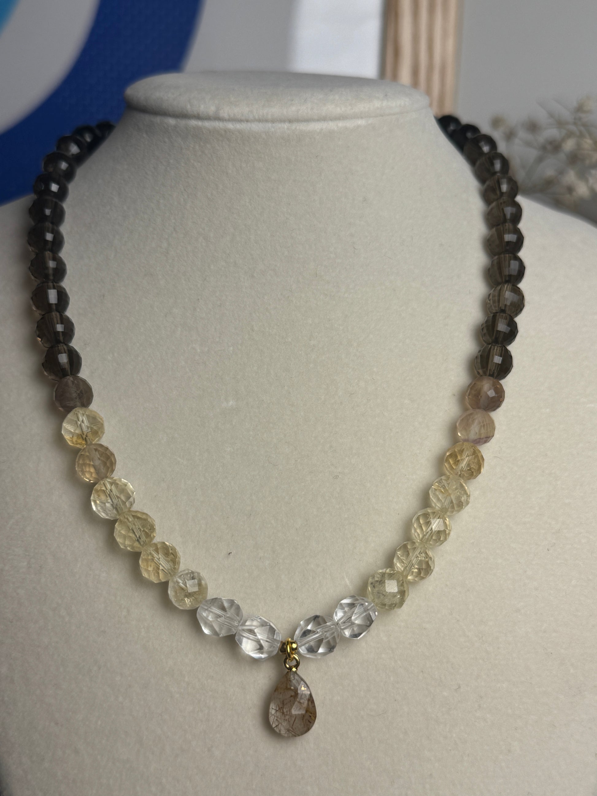 Onyx, smokey quartz, citrine, crystal quartz, and rutilated quartz pendant necklace. 14 inches with 2 inch extender and gold plated lobster clasp closure
