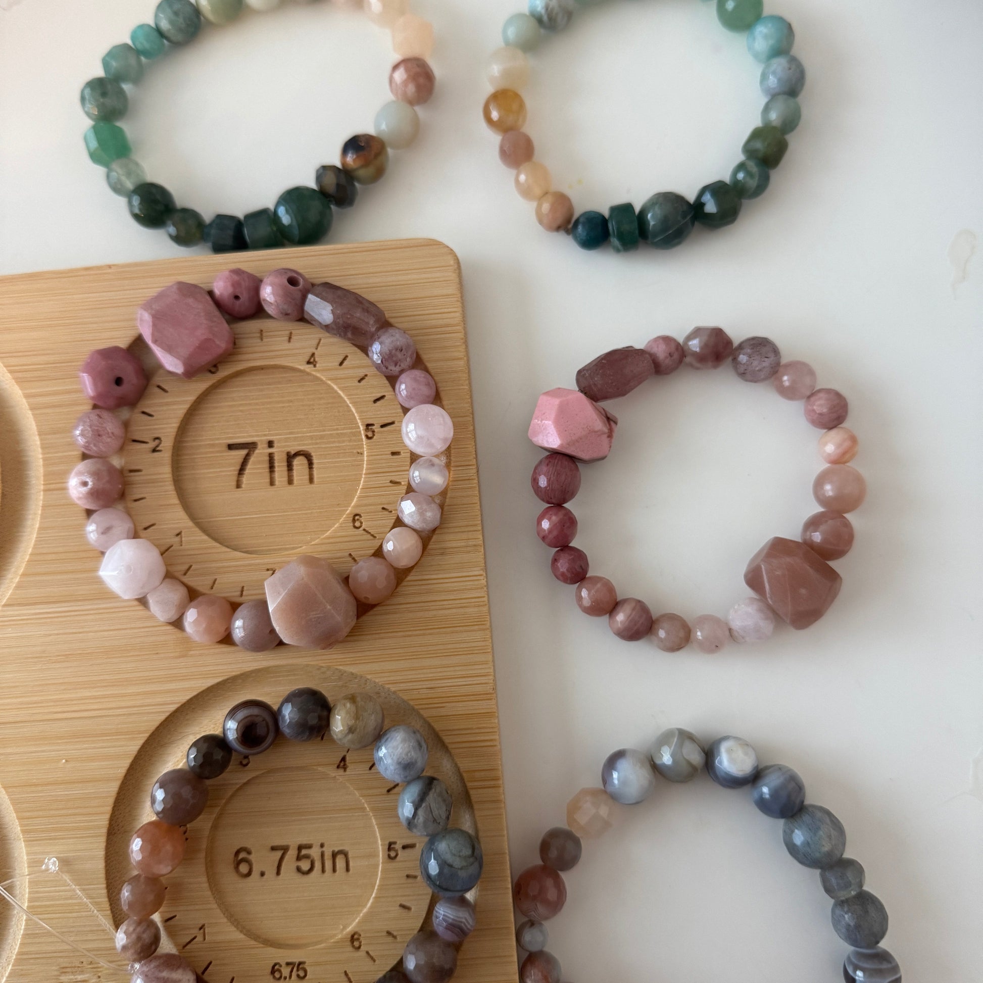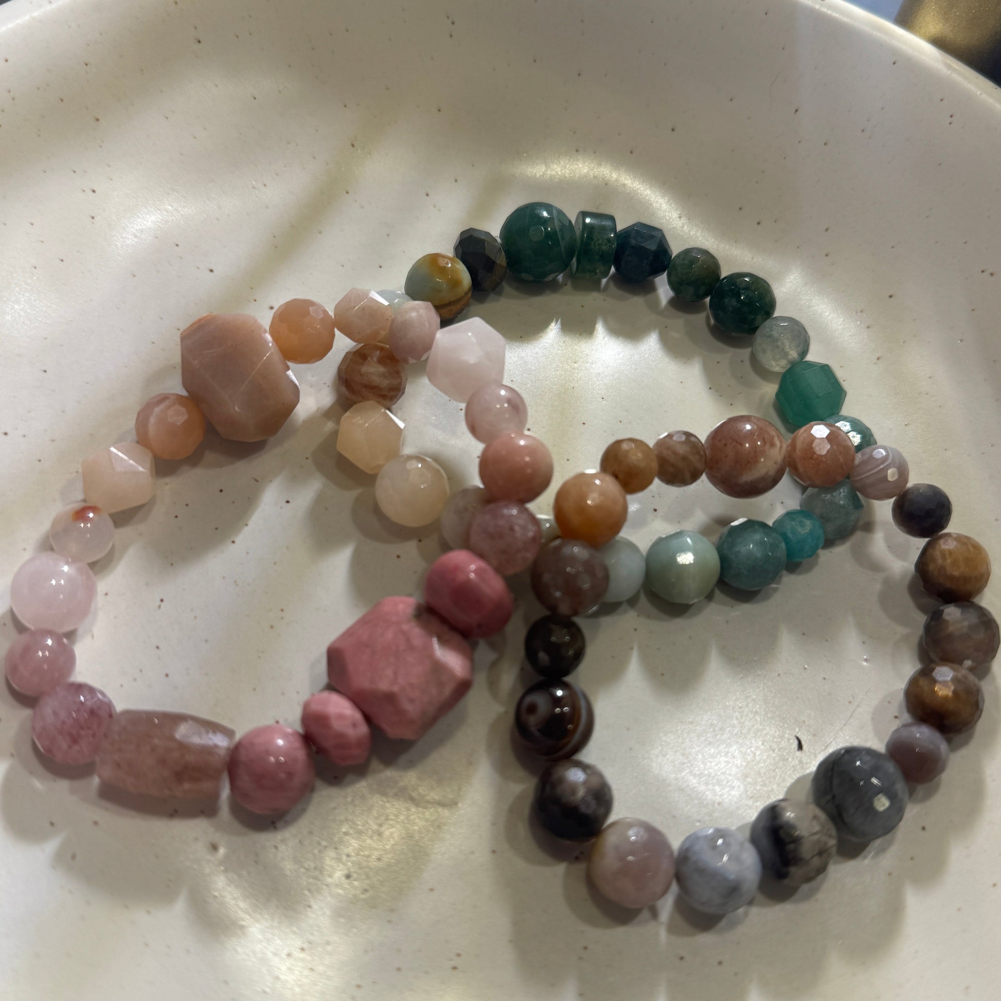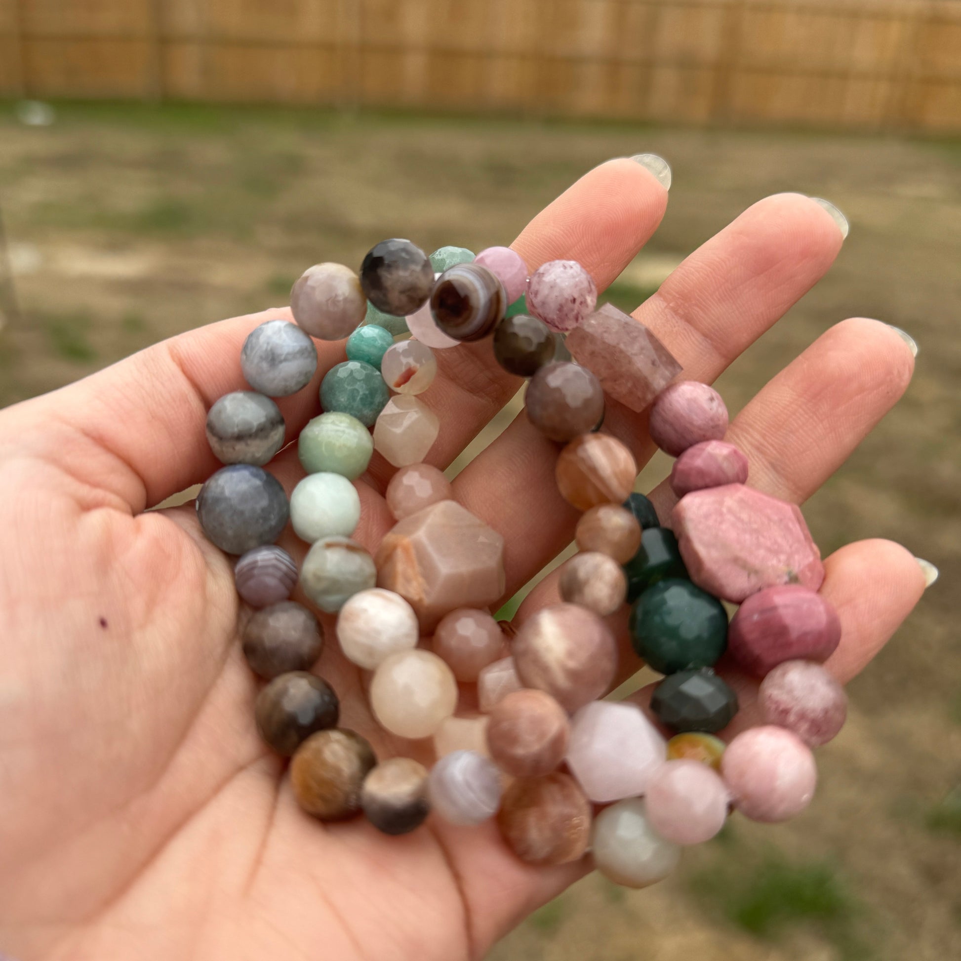 30 unique types of high quality gemstone beads including peach moonstone, rose quartz, amazonite, aventurine, labradorite, sunstone, and rhodonite.
